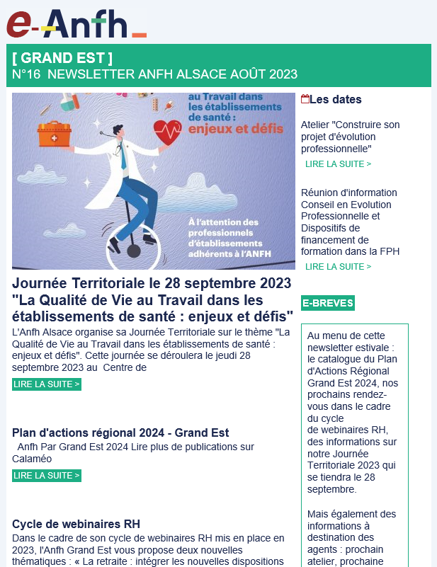 Chaque mois, l'équipe de l'Anfh Alsace vous informe, par le biais de sa newsletter, des actualités de la Délégation, des temps forts et dates à retenir.