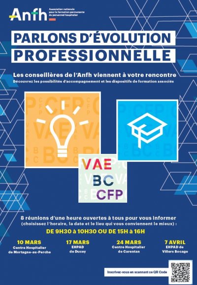 L’objectif de ces réunions sera de prendre connaissance des possibilités d’accompagnement via l’ANFH, dans le cadre de la mise en œuvre d’un projet d’évolution professionnelle.