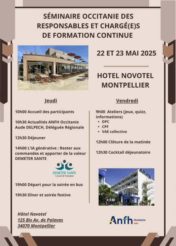 - Fait le point sur les actualités de l’ANFH Occitanie, présentées par la Déléguée régionale Aude Delpech - Découvert les usages concrets de l’IA générative avec Déméter Santé, entre maîtrise des outils et création de valeur - Exploré en ateliers les enjeux et modalités du DPC, du CPF et de la VAE collective, pour mieux comprendre comment ces dispositifs peuvent renforcer les parcours professionnels et soutenir le développement des compétences dans la fonction publique hospitalière. - Partagé des moments conviviaux, lors des temps de repas et de la soirée festive du jeudi soir Un grand merci aux intervenant(e)s et à tous les participant(e)s pour leur bonne humeur, dynamisme qui a permis de faire de ce séminaire un chaleureux moment de partage !