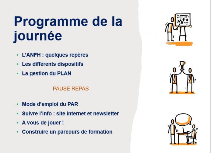 A cette occasion quelques repères historiques sur la création de l’ANFH et ses misions ont été rappelés. Emmanuelle JAN et Alice LEJAY ont pu aborder les notions essentielles à la compréhension de la gestion du plan. Les règles de bases de l’éligibilité et de remboursement ont été présentées sous forme de jeu, l’essentiel à retenir étant de savoir trouver l’information.