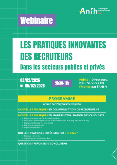 L’ANFH AURA vous propose un nouveau webinaire RH (deux dates possibles) sur le thème : « Les pratiques innovantes des recruteurs dans les domaines publics et privés ».