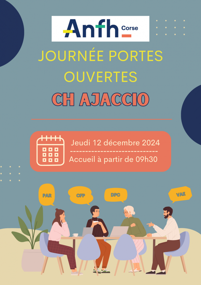 Toute l'équipe de l'Anfh Corse vous retrouve le 12 décembre 2024 lors d'une journée Portes Ouvertes sur la Formation au CH d'Ajaccio !