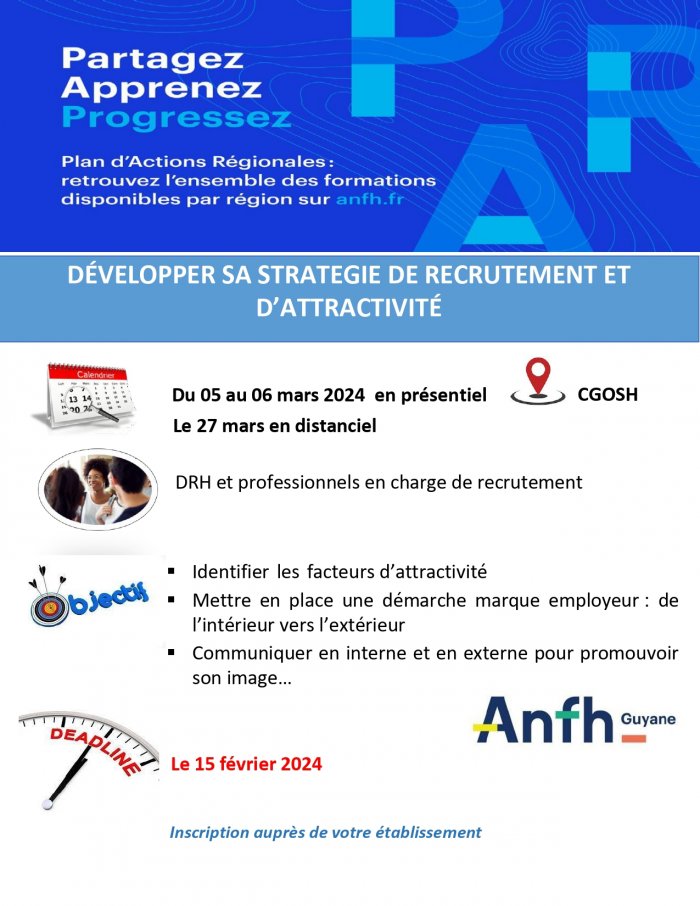 Précédent Suivant Offre de formation Publié le 16/02/2024 FICHE ACTION AFN DÉVELOPPER SA STRATEGIE DE RECRUTEMENT ET D’ATTRACTIVITÉ Email Imprimer