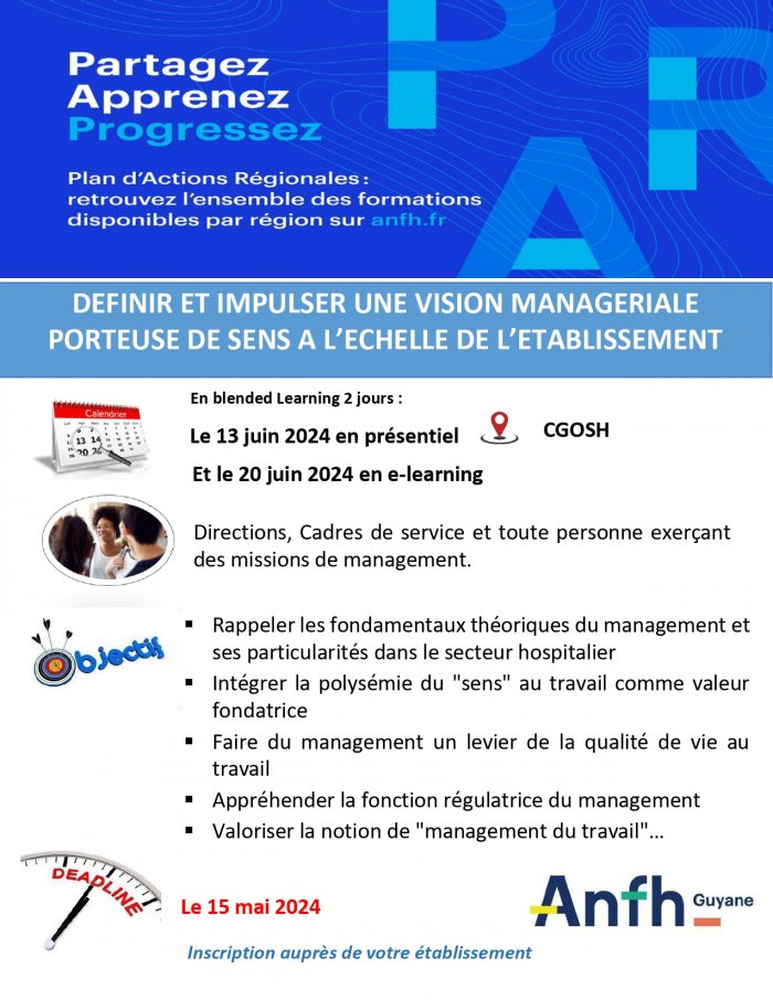Précédent Suivant QVT Publié le 29/04/2024 FICHE ACTION AFR Définir et impulser une vision managériale porteuse de sens les 13 et 20 juin 2024 Email Imprimer Documents utiles FICHE 278.08 ko | PDF