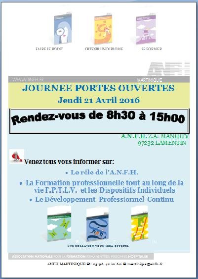 Depuis maintenant 4 ans l'ANFH Martinique organise des journées portes ouvertes, vous permettant de vous informer tout au long de cette journée sur les missions de notre délégation, au moment où vous le souhaitez, notamment dans notre relation avec les cellules formation des établissements de la fonction publique hospitalière, et bien sûr sur la Formation Professionnelle Tout au Long de la Vie (FPTLV).