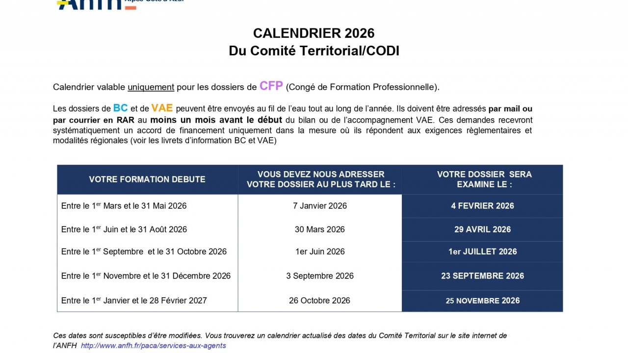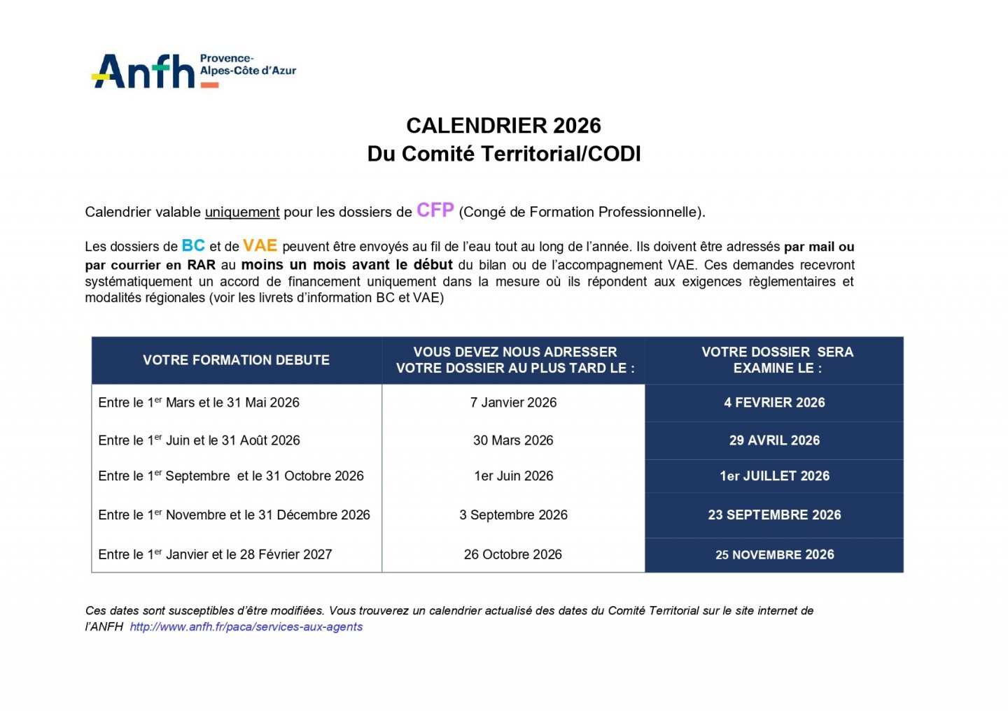 Les dossiers de CFP sont examinés par le Comité Territorial qui se réunit 5 fois dans l'année et statue sur les demandes de formation en fonction de leur date de début. Consulter le calendrier en bas de page pour les dates limites d'envoi des dossiers. Toute demande incomplète ou reçue hors délais fera l'objet d'un retour à l'agent.